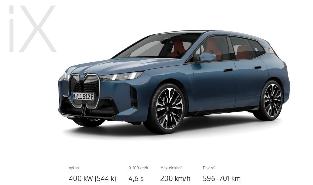 Nové BMW iX sa sebaisto ujíma vedenia. Poskytuje úplnú flexibilitu aj na dlhších cestách s čisto elektrickým dojazdom až do 701 km.1 Jasné línie a modernosť nového exteriéru dodávajú vozidlu jedinečný dizajnový slovník a rovnako inšpirujúce sú priestrannosť, pohodlie a exkluzívnosť interiéru. Asistenčné systémy vodiča si všimnete iba tak, že je vďaka nim každá cesta jednoduchšia, bezpečnejšia a príjemnejšia. Objavte všetky modelové varianty nového BMW iX, jeho výbavu, technické údaje plus veľa riešení pre lízing a úver.